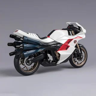 Cyclone, the machine on which Kamen Rider rides. Clear parts are used for the four headlights and the screen, and different textures are expressed by combining coloring and molding color parts for each part. Furthermore, by using a replacement muffler, it is possible to reproduce the Cyclone on which Kamen Rider No. 2 boards.